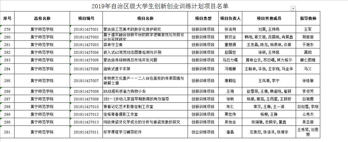 按照《关于报送2019年自治区级大学生创新创业训练计划立项项目的通知》(内教高函﹝2019﹞10号)要求,19所本科高校上报了2019年自治区级大学生创新创业训练计划项目。现将经审核通过的351项计划项目名单予以公布(其中,创新训练项目246项,创业训练项目63项,创业实践项目42项)。其中beat365在线唯一官网共计立项15项。