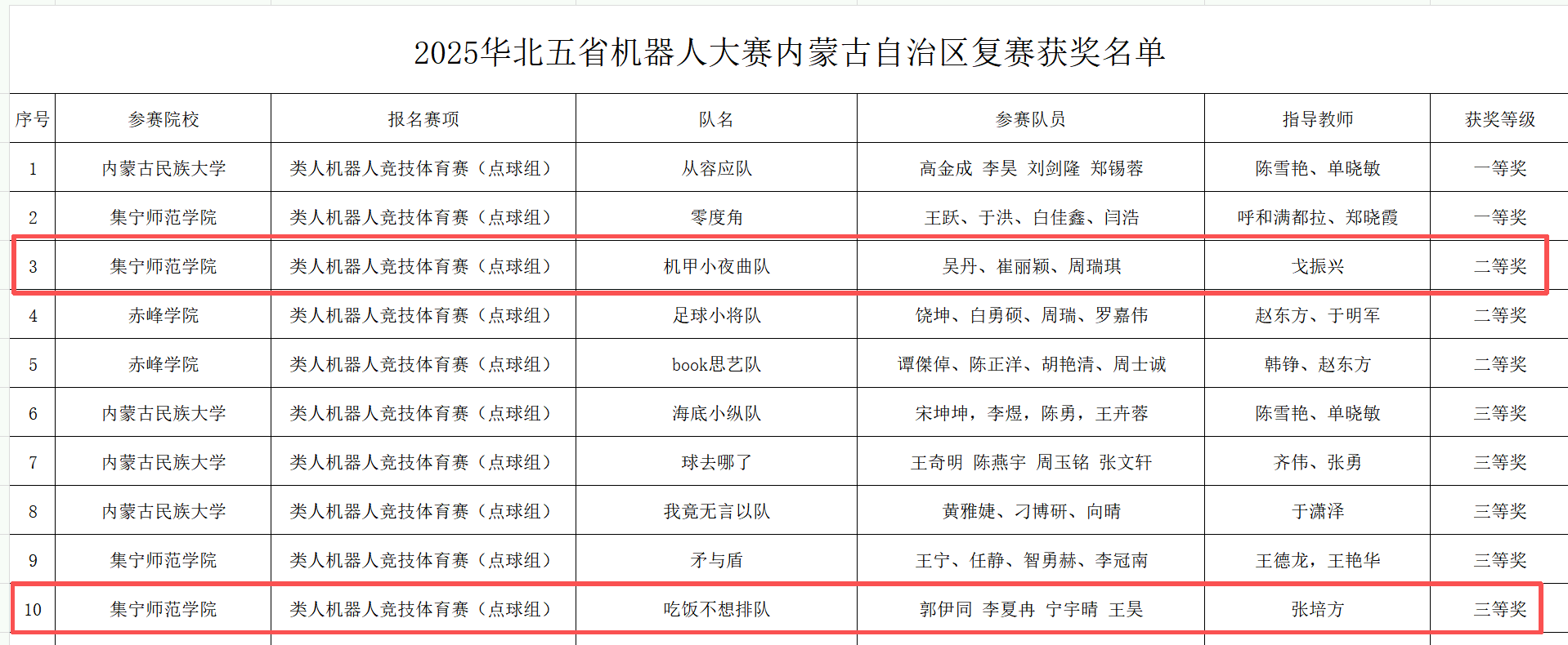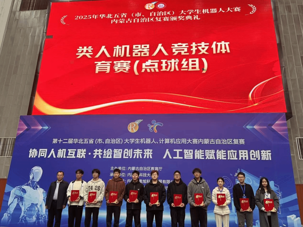 为引导广大青年学生立足机器人技术发展前沿,以创新实践推动机器人技术在竞技体育领域的应用发展。我院学子凭借出色的机器人设计与竞技能力,在 2025 华北五省机器人大赛内蒙古自治区复赛中脱颖而出!