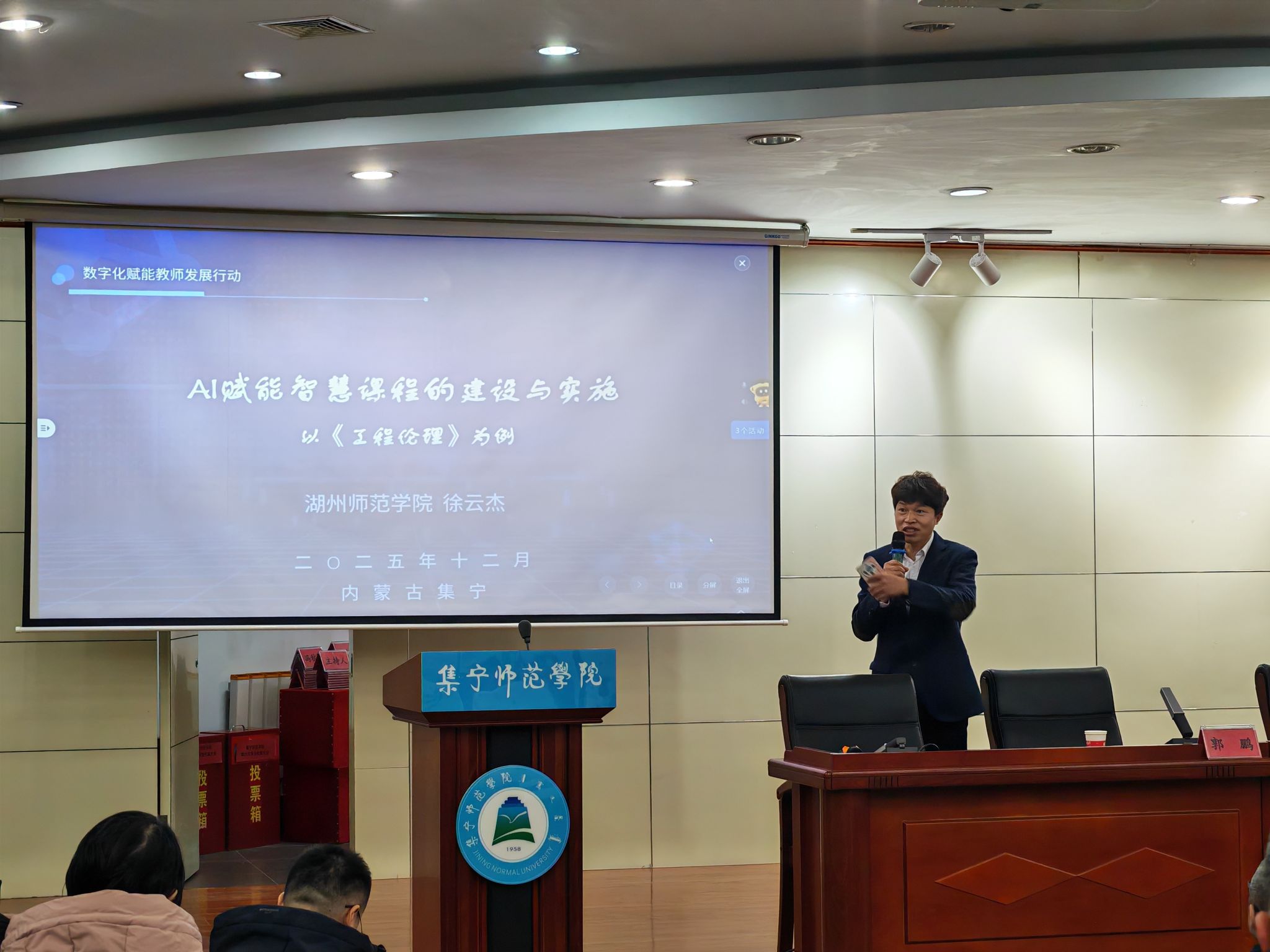 12月29日上午,湖州师范学院教授徐云杰以“AI赋能智慧课程的建设与实施”为题作理论报告,围绕“为什么要AI赋能、什么是AI工具赋能、怎么进行AI赋能”三个问题,从全球数字教育发展趋势与国家政策导向切入,系统解读了AI赋能教育的必要性与实践路径。他结合《工程伦理》课程案例,详解了知识图谱构建、AI教案生成、智能批阅等核心应用,展示了AI在课前备课、课中互动、课后评估全流程的赋能场景,强调教师应向“学习设计师”转型,实现技术赋能与育人本质的有机统一。
