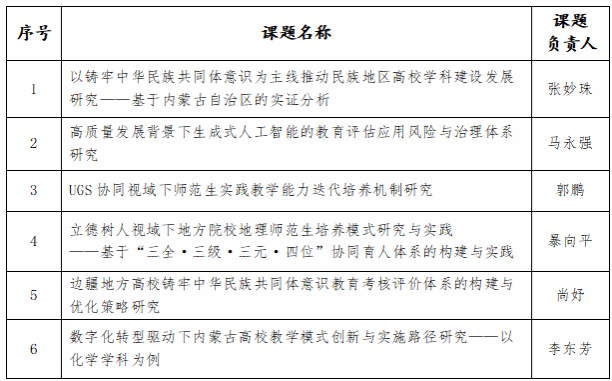 根据内蒙古自治区高等教育学会《关于开展高等教育研究课题立项申报工作的通知》(内高学会[2025]02号)和学校《关于组织申报内蒙古自治区高等教育学会2025年度高等教育研究课题的通知》要求,经个人申报,二级学院推荐,学校组织校外评审,现将拟推荐内蒙古自治区高等教育学会的课题名单公布如下: