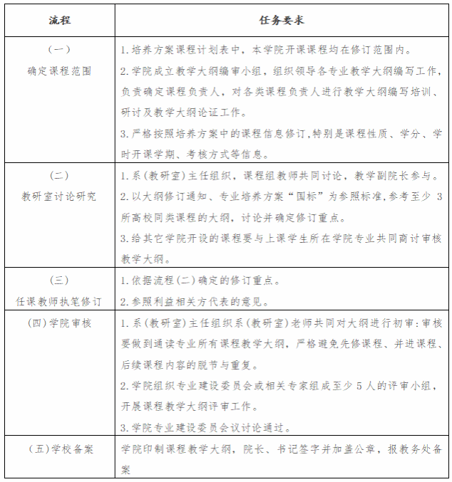 各学院课程教学大纲的研制、修订和审定过程须形成过程档案材料,具体修订流程如下表。