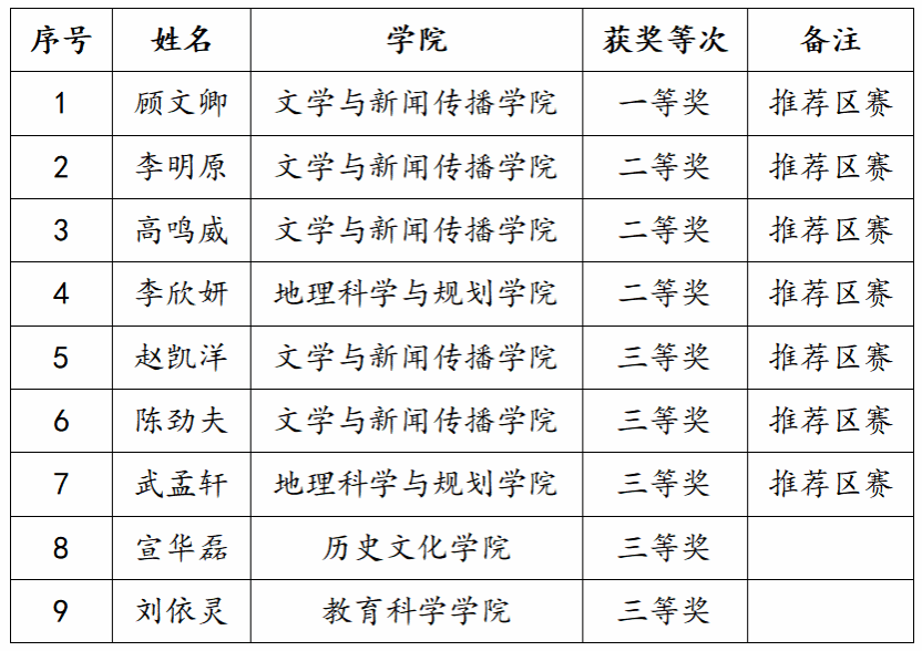 入围团体赛复赛的6个团队分别是文学与新闻传播学院代表队、地理科学与规划学院代表队、历史文化学院代表队、物理与电子信息工程学院代表队、生命科学与技术学院代表队和经济与管理学院代表队。