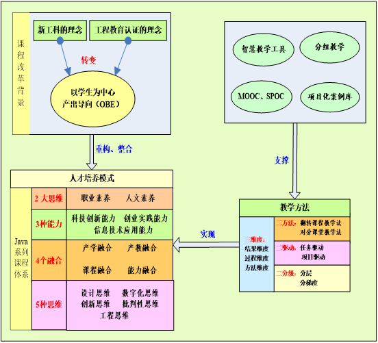团队成员以OBE为导向,加强了课程群课程间联系,将大学四年所学知识“串”起来,整合更新和充实各课程的教学内容,促进了知识的前后呼应、相互渗透。对课程资源整合,形成理论联系实际,最终服务应用,构建了“二大素养、三种能力、四个融合和五种思维”的课程教学内容体系,如Java方向课程群改革总体框图所示。