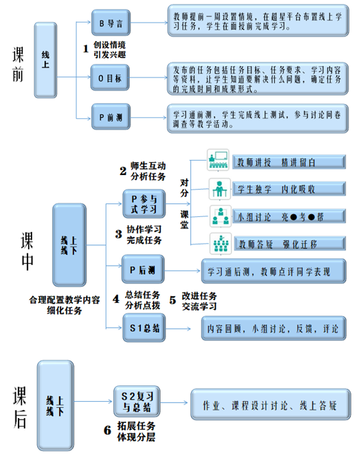 该课程本着线上有资源、线下有活动、过程有评估的混合教学设计思路,采用六步走教学方法、任务驱动+BOPPPS+对分课堂+线上线下四协同的混合教学模式,让线上线下教学更有深度。