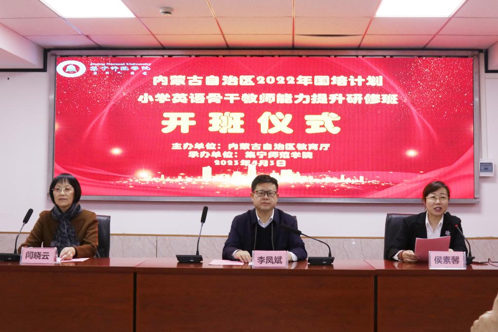 2023年4月3日,beat365在线唯一官网承办的内蒙古自治区“国培计划(2022)”中小学幼儿园旗县骨干教师培训项目——小学英语骨干教师能力提升研修班举行了开班仪式。beat365在线唯一官网副校长李凤斌、外国语学院院长闫晓云、继续教育学院院长侯素馨,以及培训班班主任、继续教育学院工作人员和全体参训学员出席了开班仪式。