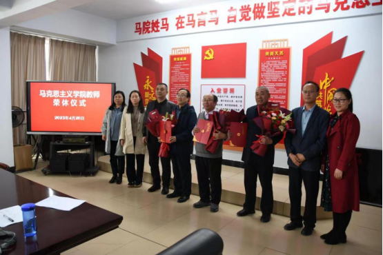为落实尊师重教政策,服务广大荣休教职工,表达对2022年以来荣休的三位教职工的敬意和感激,鼓励广大教职工以更加饱满的工作热情投入工作。4月20日,马克思主义学院为江国华、欧军、哈斯布和三位退休教师举办荣休仪式。荣休仪式在马克思主义学院409会议室举行。出席仪式的有离退休人员工作处处长常晓华、副处长马晓玉,教师工作部人事科科长刘晓鹤,马克思主义学院全体教师参加。荣休仪式由马克思主义学院党总支副书记、院长杨明霞主持。