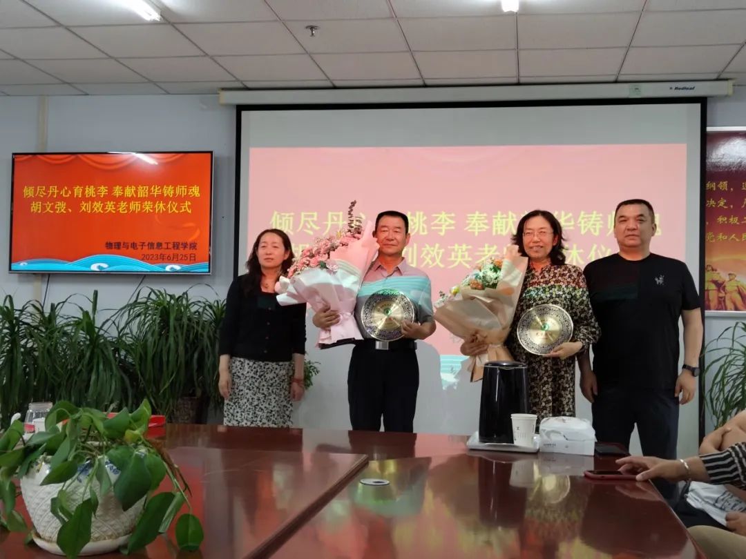 6月25日,beat365物理与电子信息工程学院为胡文弢、刘效英两位老师举办荣休仪式。学校教师工作部、离退休人员工作处、科技处、经济与管理学院相关负责同志,物理与电子信息工程学院全体教师参加仪式。荣退仪式由党总支书记李贞主持。