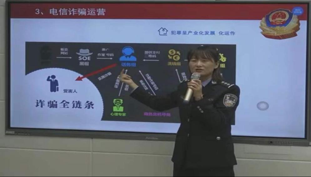王琴警官就“电信网络诈骗几种套路”、“电信网络诈骗识别公式”进行了详细讲解,并结合实际案例介绍了当前常见的诈骗手段,如网络诈骗、电话诈骗、短信诈骗等等。通过案例分析,告诉大家如何识别和防范诈骗手段以及遭遇诈骗时如何应对,并提醒大家在生活中时刻保持警惕,避免上当受骗。
