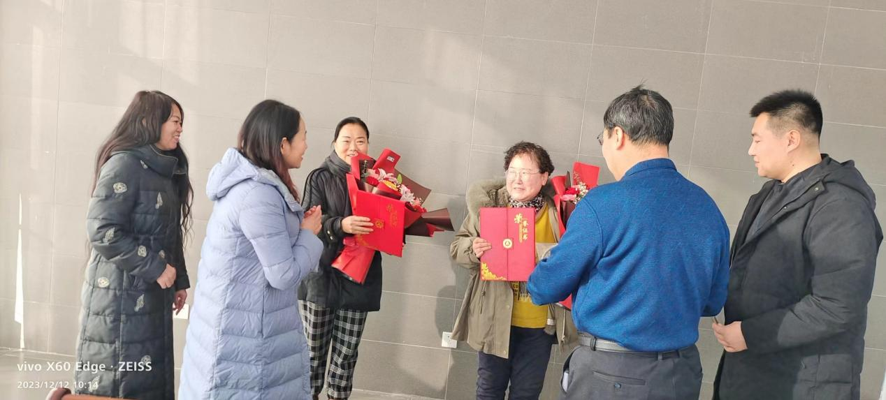 最后马晓玉、刘丰、巩立红代表学校为史玉茹老师与海棠老师颁发了荣休证书、纪念品,并送上鲜花与祝福。