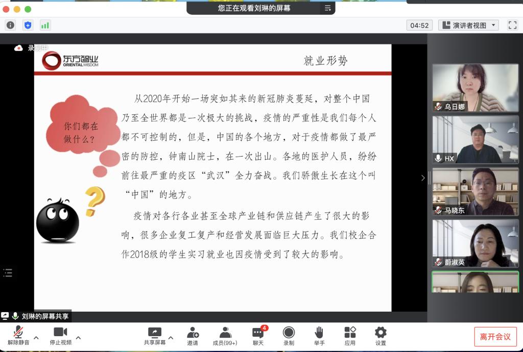 会议第二项由合作办学企业方代表东方智业的刘琳老师为毕业生分析就业现状和择业准备工作如何开展。