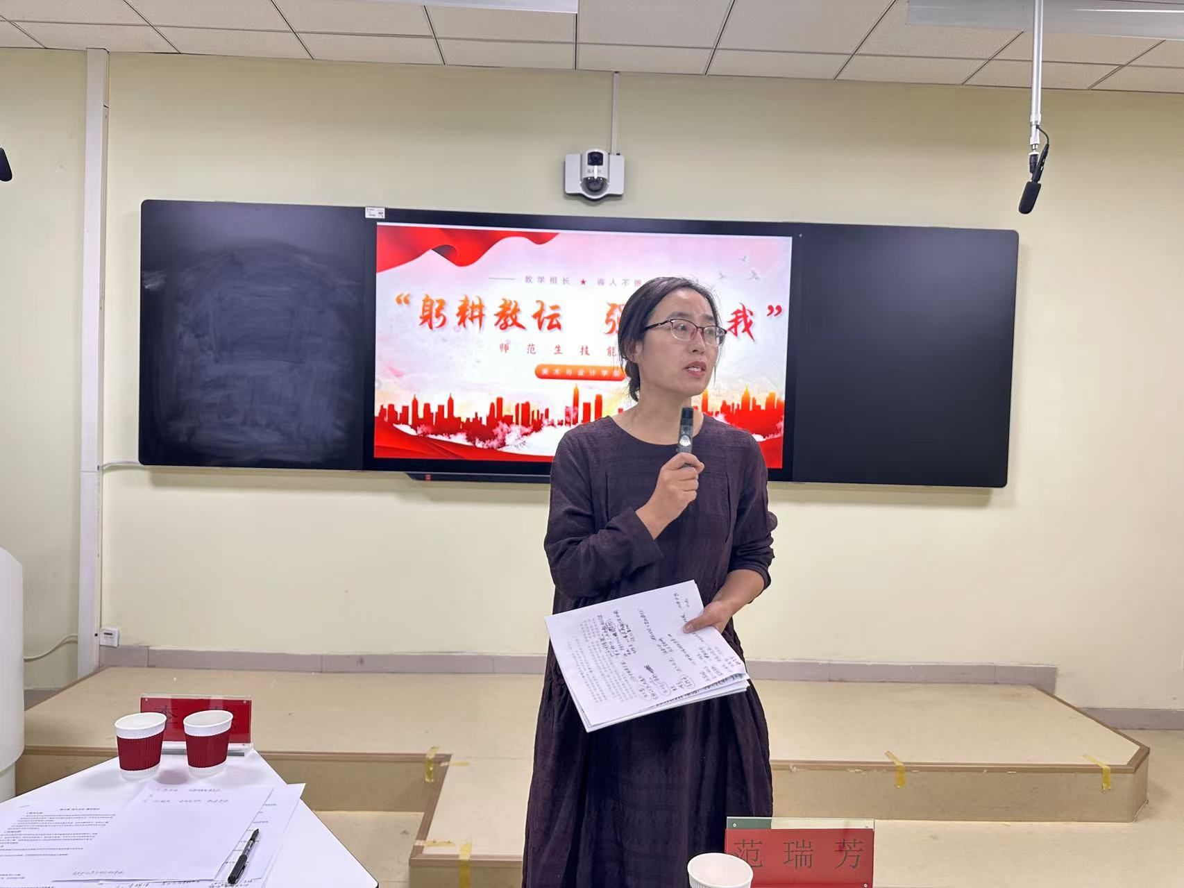 美术学系主任、教授范瑞芳从着装、教态、知识结构、课程导入、教学方法、教学内容、板书设计、课件制作等几个方面进行现场点评,并与参赛选手分享教育教学的先进理念和实践经验,特别强调在符合教学规范的同时,发掘与打造自身教学个性,并坚持以学生为中心的教学理念,为教育实习奠定扎实的教学基础。