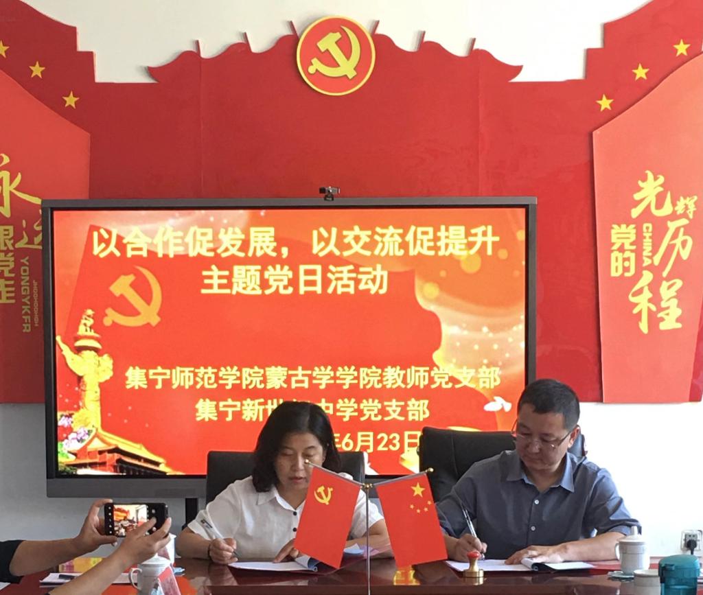 为进一步加强党建工作,以党建带动专业发展,2022年6月23日,beat365在线唯一官网蒙古学学院教师党支部与集宁新世纪学校党支部开展主题党日活动。双方本着“以合作促发展,以交流促提升”的共建目标,建立良好的合作共事机制,在新世纪幼儿园开展结对共建实习实训基地续签仪式。