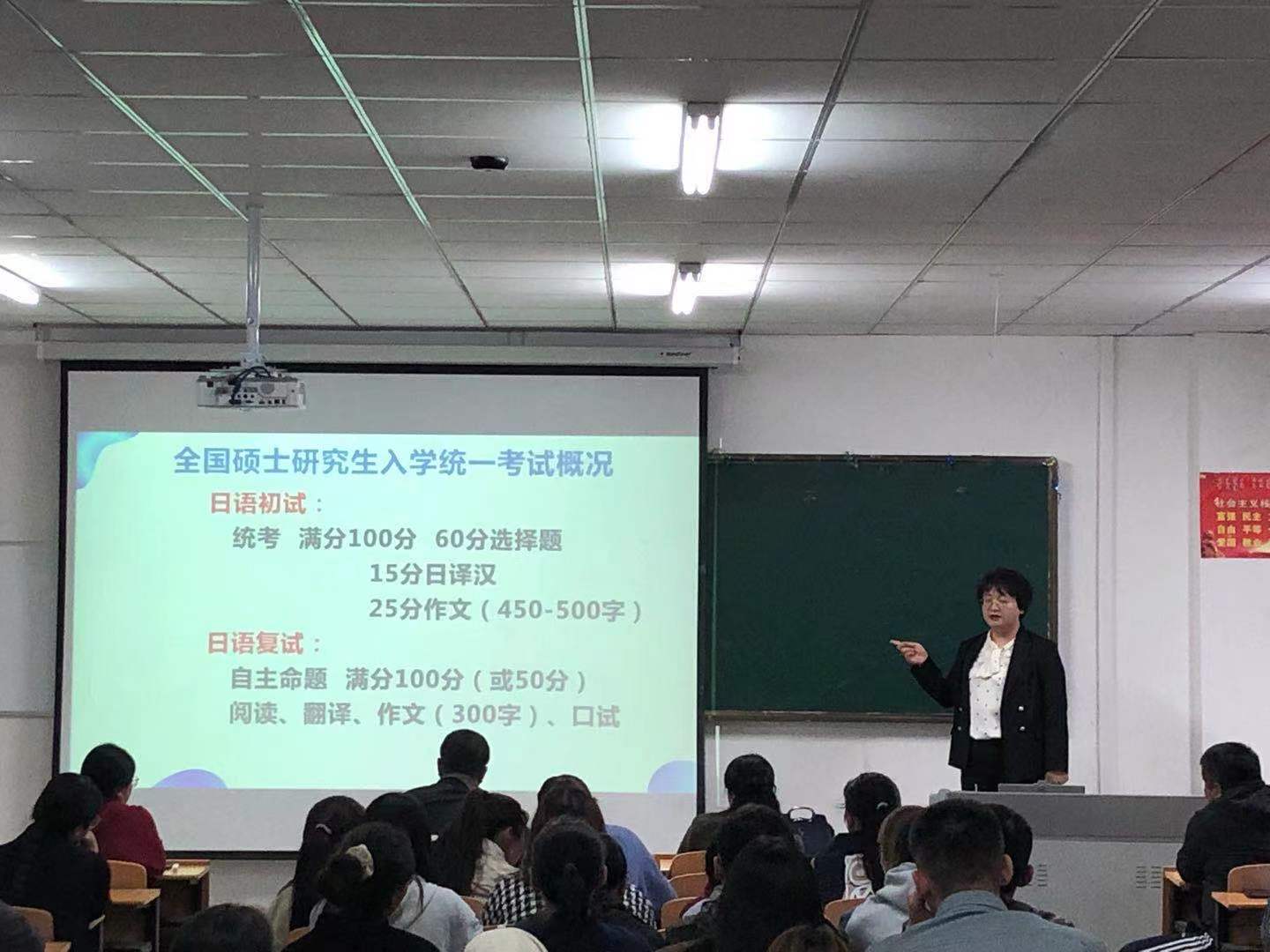 敖敦老师从全国硕士研究生统一考试概况、考研日语试卷结构及难度、少数民族考生分数线变化情况等方面开展了讲解。会上还为我院优秀考研生乌日罕发放了敖敦教育优秀考研生奖学金及证书。