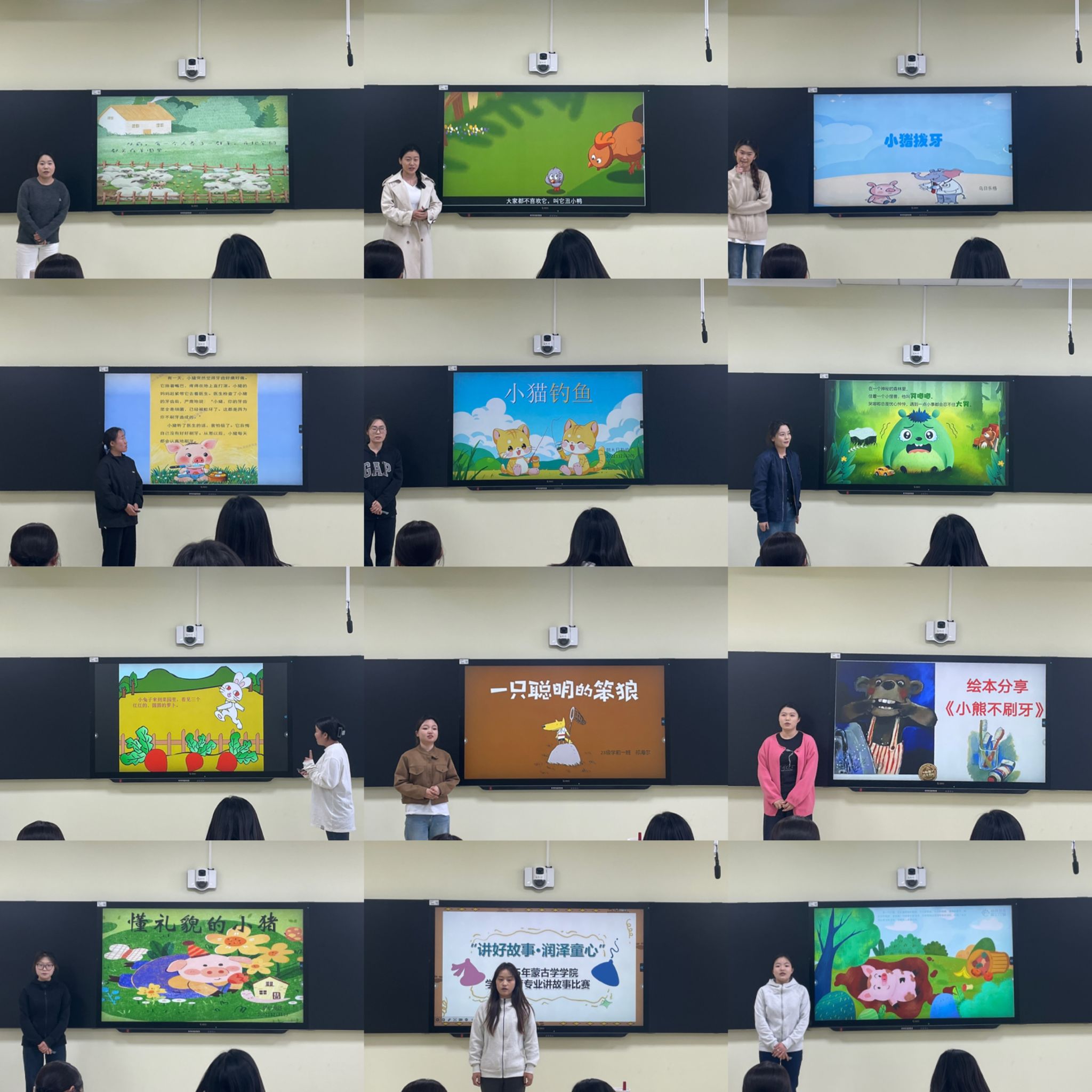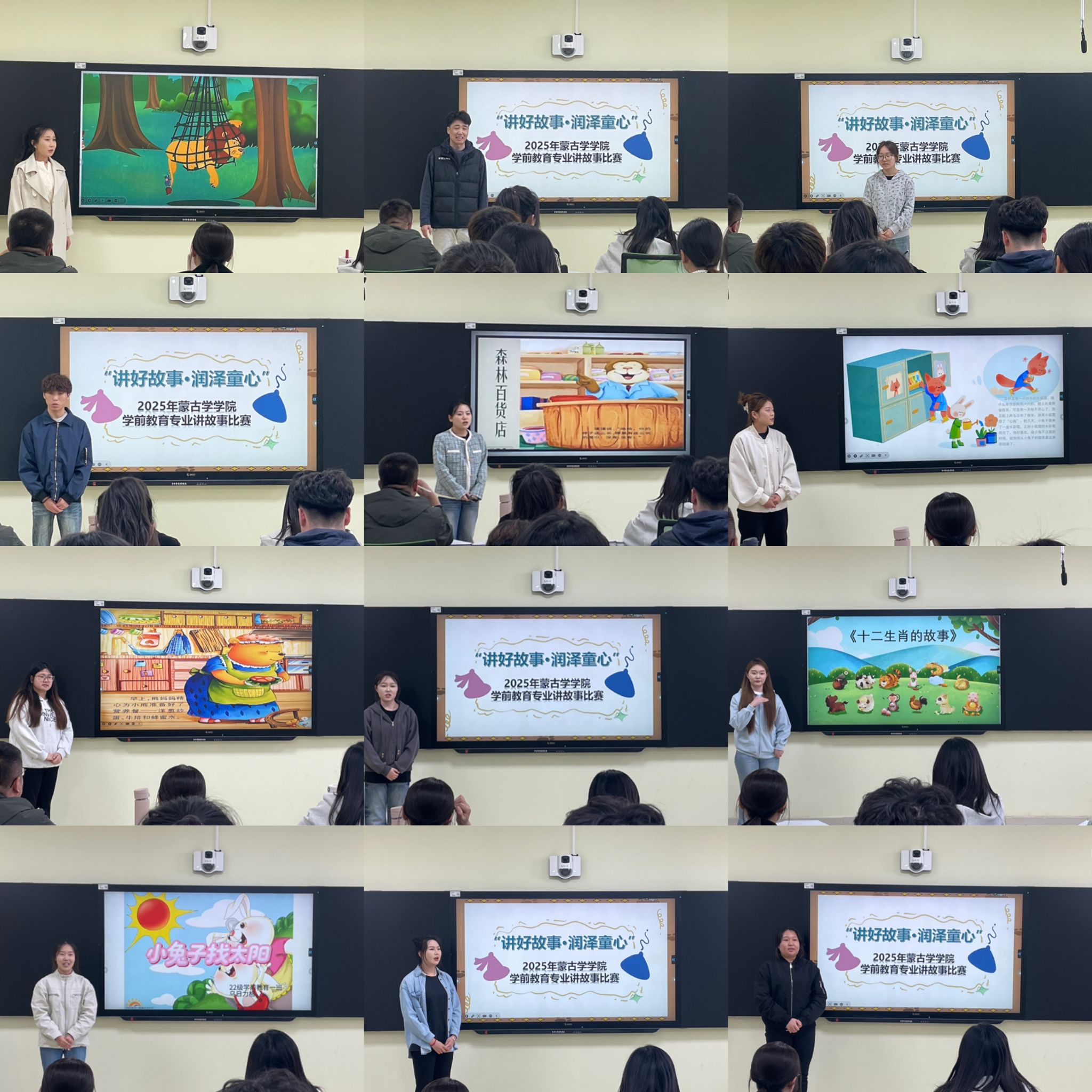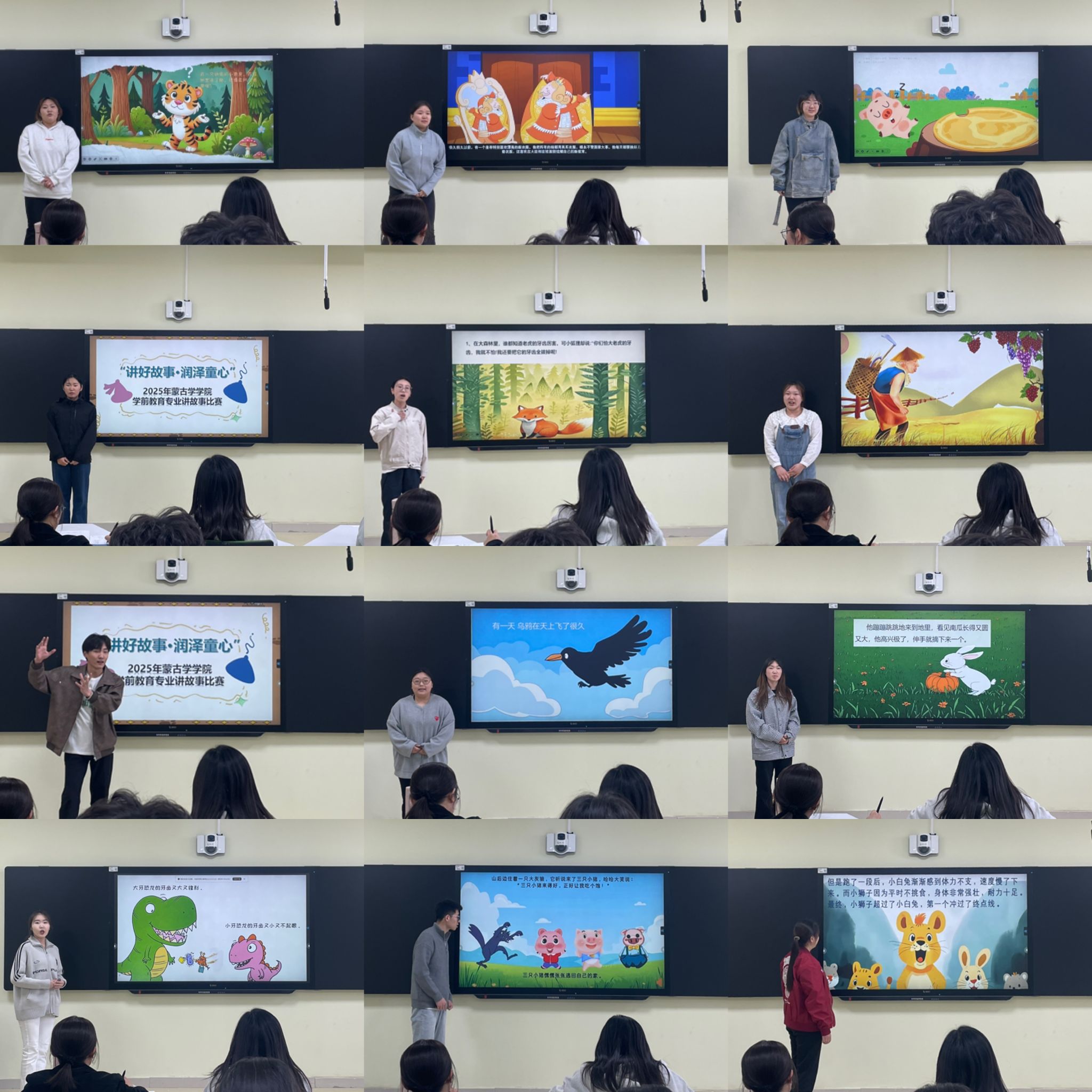 比赛从故事内容、语言表达、表现力及整体效果四大维度进行综合评分。参赛选手围绕中华传统故事、经典童话、寓言及原创儿童故事展开讲述,内容紧扣3-6岁儿童认知特点,融入社会主义核心价值观与生活教育主题,兼具教育性与创新性。选手们通过生动的语言、丰富的表情,结合道具、音乐、PPT及肢体表演,展现教学实践能力,比赛时间严格控制在5-8分钟内。活动首次启用蒙古学学院36101智慧教室,通过数字化设备增强互动体验,为评委和观众提供了更直观的展示效果。