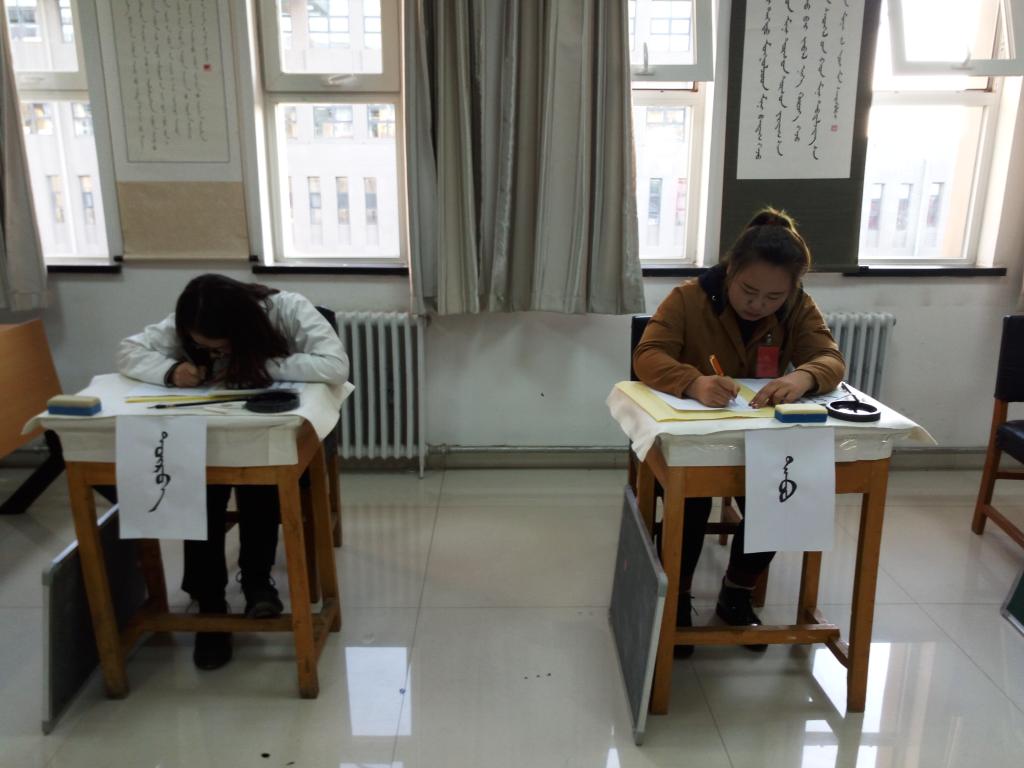 由校团委主办,蒙文系承办的beat365在线唯一官网第九届“墨缘杯”三笔字大赛蒙文组决赛之蒙文系第七届“素义蓝都勒”三笔字比赛于2017年11月16日在白海校区蒙文系教学楼213教室举办。系主任南斯力玛、系党总支副书记朝格图,系教学主任孟美英观看比赛。白秀梅、英雄、特日格乐三位老师担任比赛评委。