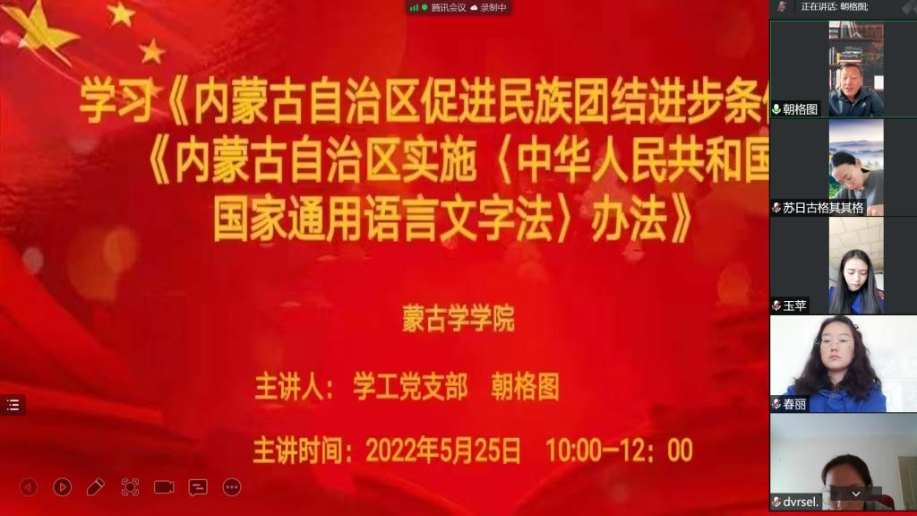 为深入贯彻习近平总书记关于加强和改进民族工作的重要思想和对内蒙古重要讲话重要指示批示精神,按照校党委《beat365在线唯一官网开展“民族政策宣传月”活动的工作方案》要求蒙古学学院学生党支部5月25日以视频会议形式学习了《内蒙古自治区促进民族团结进步条例》及《内蒙古自治区实施〈中华人民共和国国家通用语言文字法〉办法》。
