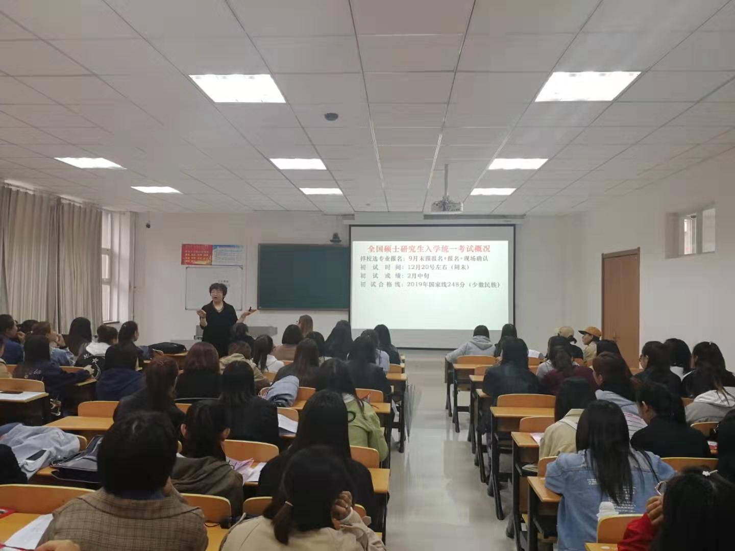 敖敦老师作了考研形势分析报告。他从报考人数有较大增加、学硕求学难度会加大、推免生比例逐步增加、非全日制呈上升趋势、国家线参考价值下降、二战考生人数逐年增多等方面分析了考研基本形势,希望同学们对自己合理定位,正确选择报考院校和专业,积极把握调剂机会,既不好高骛远,也不妄自菲薄,争取在2020年研究生考试中捷报频传,为个人争荣誉,为学院添光彩。