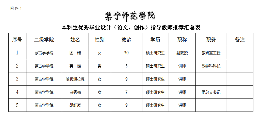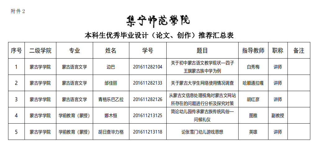 根据《关于做好2020届本科生校级优秀毕业设计(论文、创作)和优秀指导教师推荐评选工作的通知》精神,我院组织了2020届本科生优秀毕业论文(论文、创作)的申报工作。经学院答辩委员会评选推荐、教研室审核,确定《论张雪门幼儿游戏思想》、《关于初中蒙古语文教学现状—四子王旗蒙古族中学为例》、《关于蒙古大学生网络使用情况调查》、《从蒙古文信息处理视角对蒙古文网站所存在的问题进行分析及探究对策》、《简论幼儿园传承蒙古族传统风俗—问候礼仪》等5篇毕业论文(论文、创作)为蒙古学学院2020届本科生优秀毕业论文(论文、创作),英雄等五位教师被评为优秀指导教师,现予公示如下: