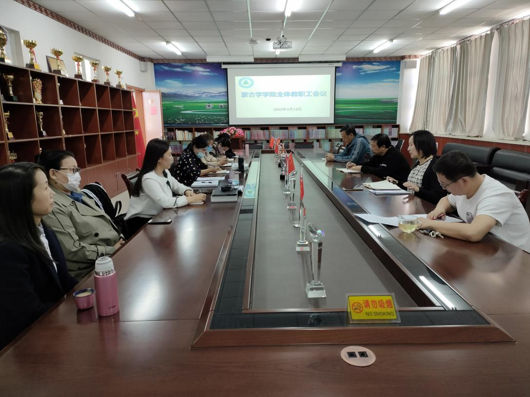 蒙古学学院于4月14日下午召开全体教职会议,学院在编在岗教职工参加会议。会议由学院党总支书记额尔敦其其格主持。