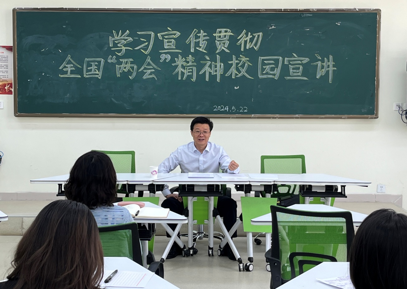 朱玉东以“发展新质生产力,推动经济高质量发展——深入学习贯彻全国‘两会’精神”为题,紧扣社会热点,结合宣讲重点,主要围绕2024年全国“两会”概况、习近平总书记在全国“两会”期间发表的系列重要讲话精神、2024年经济社会发展总体要求及政府工作任务、以新质生产力推动经济高质量发展四个方面,运用通俗易懂的语言和生动活泼的事例,对全国“两会”精神进行了系统、全面、深入的宣讲。他与大家一起学习全国“两会”期间习近平总书记的重要讲话精神,结合青年学生学习生活就业实际及老百姓的日常生活讲述如何理解新质生产力的问题,勉励青年学子作为新时代的青年,一定要认真学习全国“两会”精神,坚定理想信念,努力学习科学文化知识, 提升创新能力,不负光阴、不懈奋斗,争做有理想、敢担当、能吃苦、肯奋斗的新时代好青年。