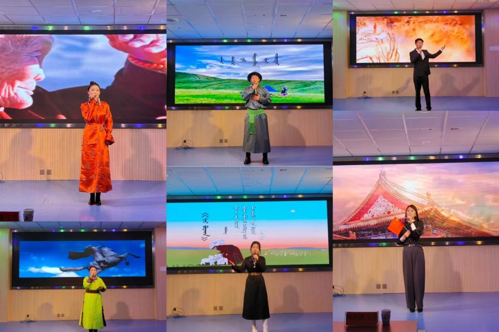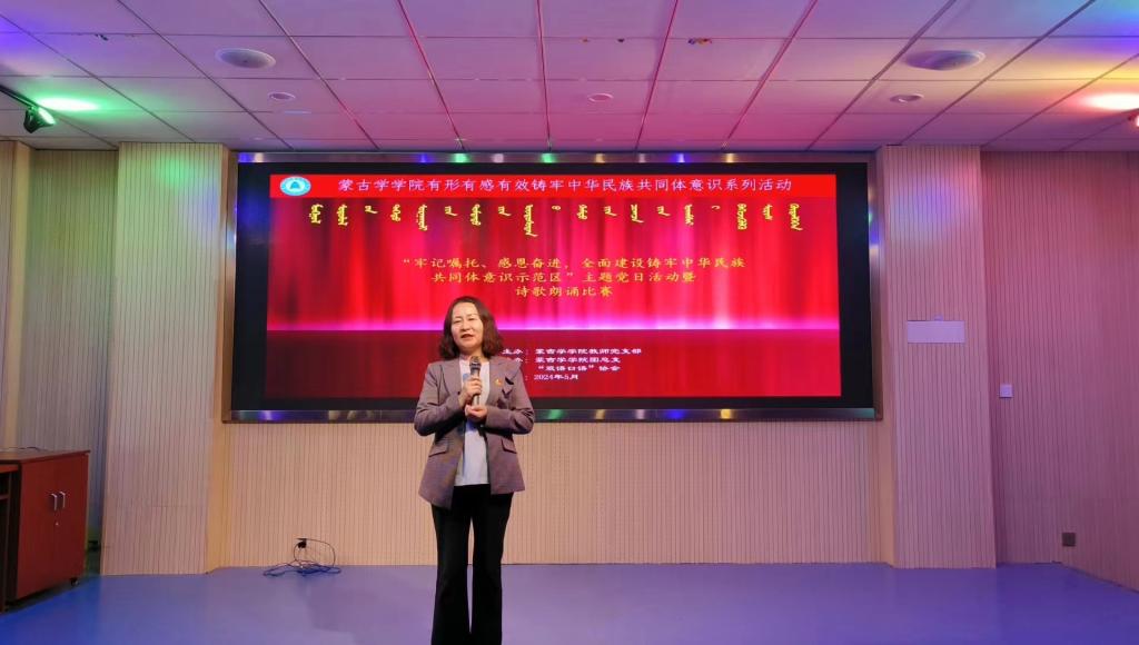 为以“一周两周”为抓手,深化民族团结进步教育,铸牢中华民族共同体意识,丰富校园文化生活,5月23日,蒙古学学院举办“牢记嘱托、感恩奋进、全面建设铸牢中华民族共同体意识示范区”主题党日活动暨诗歌朗诵比赛。活动由蒙古学学院教师党支部、团总支联合举办,学院“双语口语”协会协助开展。
