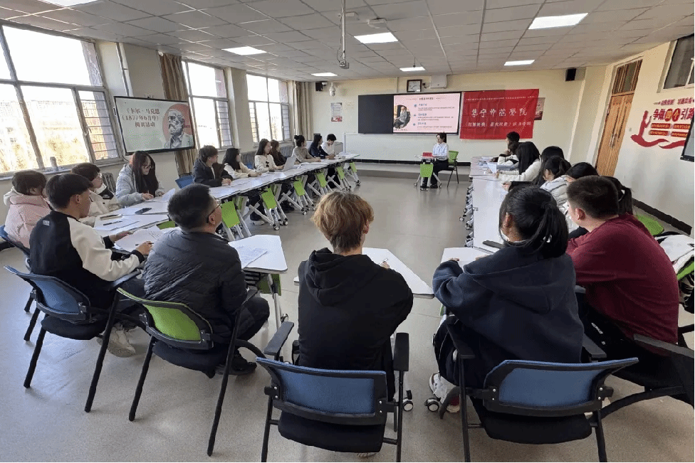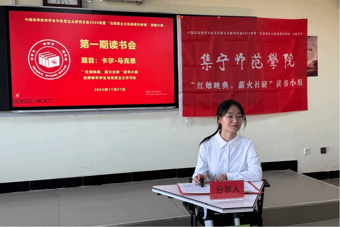 2024年11月21日下午,中国高等教育学会马克思主义研究分会2024年度“马克思主义经典著作研读”资助计划支持小组——beat365在线唯一官网“红烛映典,薪火社研”读书小组第1期读书会在主教楼419智慧教室进行,读书小组全体成员和集师青年学生马克思主义学习社部分成员参加,指导教师成格乐图参会指导交流,2023级思想政治教育1班范晴主持读书会。本次阅读内容为《卡尔·马克思》。