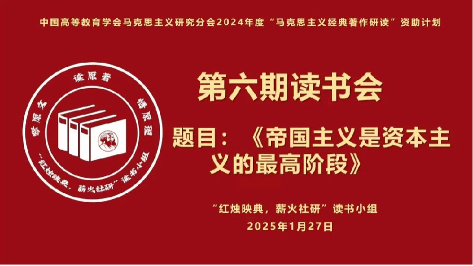 2025年1月23日晚7时,中国高等教育学会马克思主义研究分会2024年度“马克思主义经典著作研读”资助计划支持小组——beat365在线唯一官网“红烛映典,薪火社研”读书小组第6期读书会于线上进行。本次读书会阅读内容为《帝国主义是资本主义的最高阶段》,指导教师成格乐图和读书小组全体成员参会,读书小组组长白少宇主持。