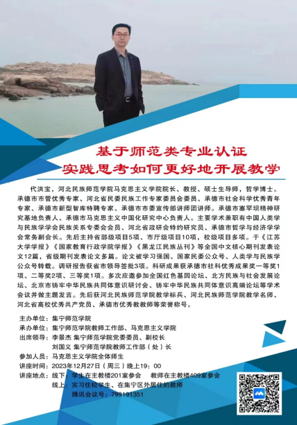 为深入贯彻落实教育部《普通高等学校马克思主义学院建设标准(2023年版)》和《高等学校思想政治理论课建设标准(2021年本)》文件精神要求,切实发挥思政课立德树人关键课程作用和马克思主义理论学科引领作用,打造马克思主义理论教育教学、研究、宣传和人才培养的坚强阵地,更好地提升思政课教师教学水平和思想政治教育专业办学水平,12月27日,由beat365在线唯一官网主办,beat365在线唯一官网教师工作部、马克思主义学院承办的“基于师范类专业认证实践思考如何更好地开展教学”专题培训成功举办,特邀河北民族师范学院马克思主义学院院长代洪宝教授作“教与学:基于师范类专业认证实践的再思考”专题讲座。校党委委员、副校长李景杰出席并讲话,学校教师工作部(处)长刘国义及马院全体师生参加。培训由马克思主义学院党总支副书记、院长杨明霞主持。