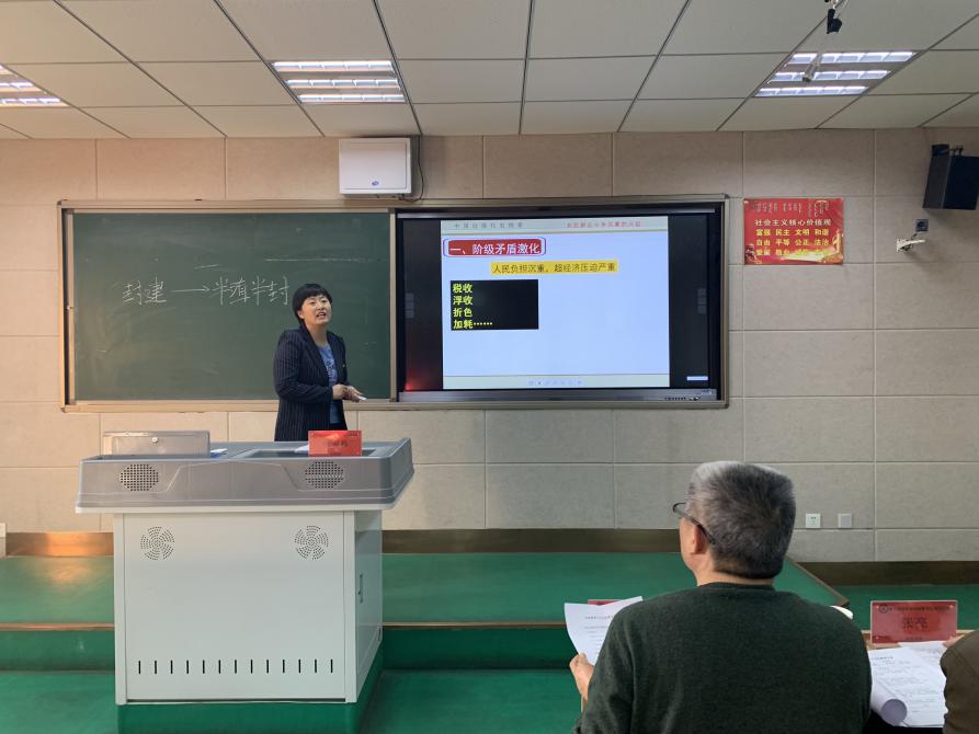 青年教师郭永兴讲了题为“为什么信仰马克思主义?”的示范课;青年教师刘晓鹤讲了题为“积极进取的人生态度”的示范课;中年教师张爱梅讲了题为“农民群众斗争风暴的兴起”的示范课,老教师江国华讲了题为“民族区域自治的定义、定位、性质”的示范课。