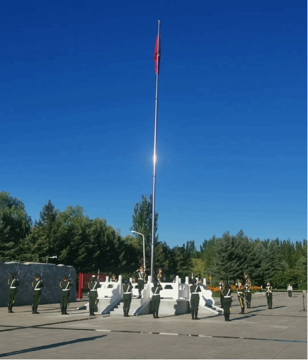 伴随着国旗护卫队铿锵有力的步伐,全校师生齐声高唱国歌,鲜艳的五星红旗在晨曦中缓缓升起,迎风飘扬。