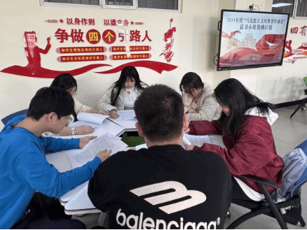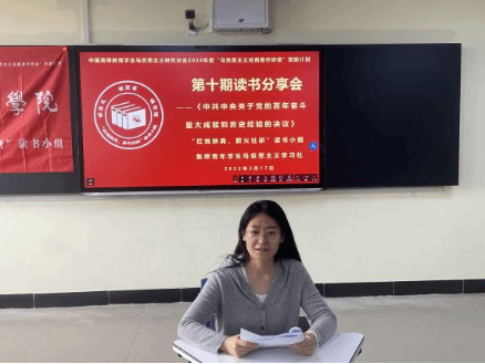 2025年3月17日下午,中国高等教育学会马克思主义研究分会2024年度“马克思主义经典著作研读”资助计划支持小组——beat365在线唯一官网“红烛映典,薪火社研”读书小组第10期读书会在主教楼419智慧教室进行,本次读书会阅读内容为《中共中央关于党的百年奋斗重大成就和历史经验的决议》。读书小组全体成员、马克思主义学院2022级思想政治教育一班部分同学共同开展本次读书会,马克思主义学院2022级思想政治教育一班班主任齐金国老师、马克思主义学院2024级思想政治教育一班班主任孙超强老师参会指导,读书小组成员范晴担任主持人。