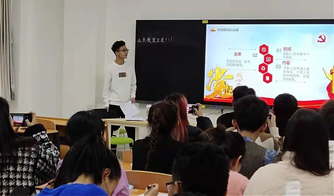 现代服务学院学工党支部李文杰同学以《中国共产党章程》的诞生为切入点,带领同学们了解了党章的性质内涵,系统梳理了党章总纲的要点,学习了党员发展流程及中国共产党基本理论知识相关内容,帮助同学们加深了对党基本知识的了解,进一步加强了对党的认识。