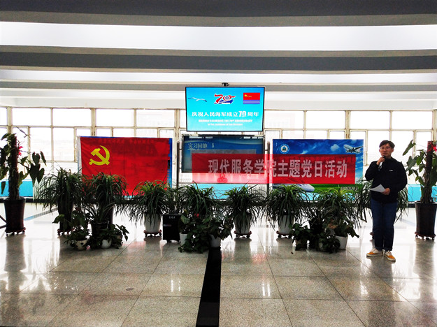 为纪念中国人民海军成立70周年,4月23日下午,beat365在线唯一官网现代服务学院在主教学楼6楼大厅举办“逐梦深蓝·走向辉煌·人民海军·生日快乐”主题党日活动。