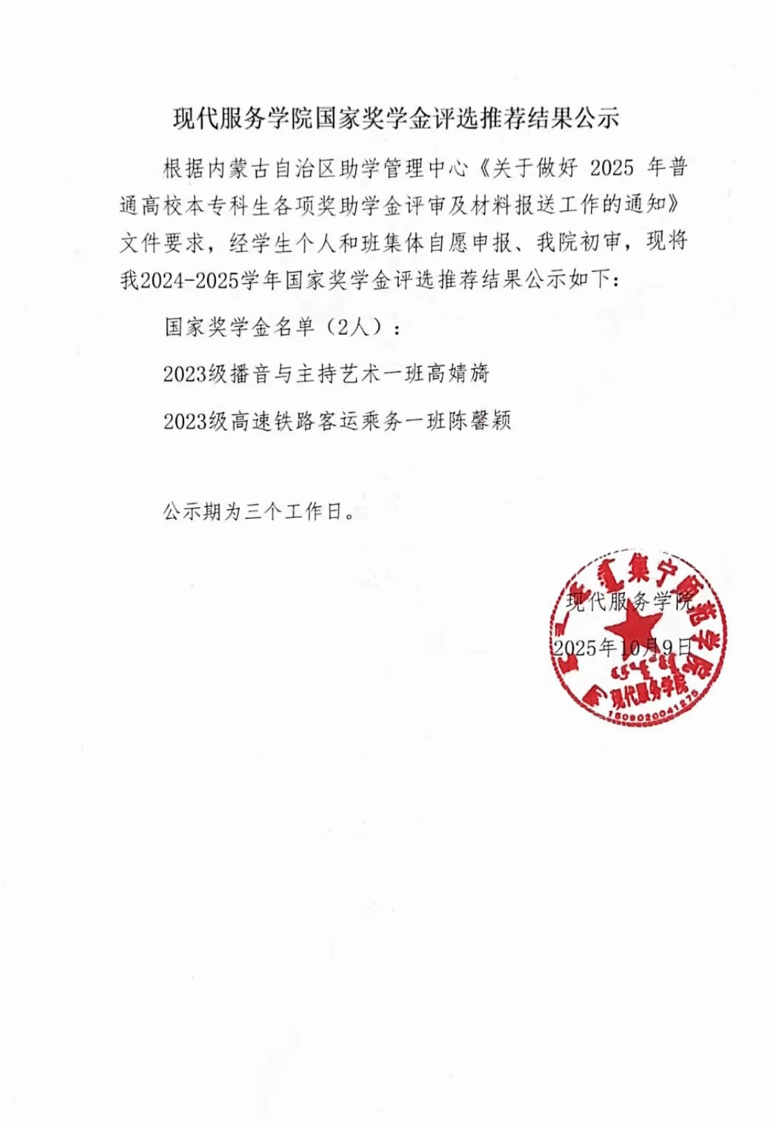 现代服务学院2024-2025学年国家奖学金评选推荐结果公示