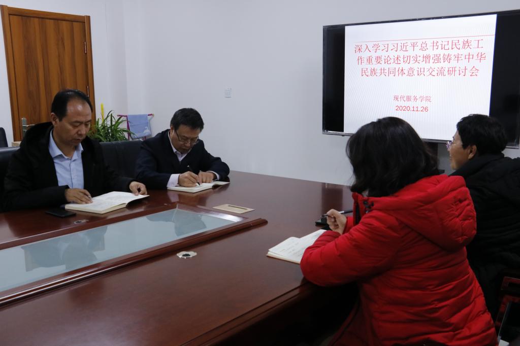 根据会议精神,现代服务学院领导班子在11月26日下午5点,进行学习习近平总书记民族工作重要论述切实增强铸牢中华民族共同体意识交流研讨会。