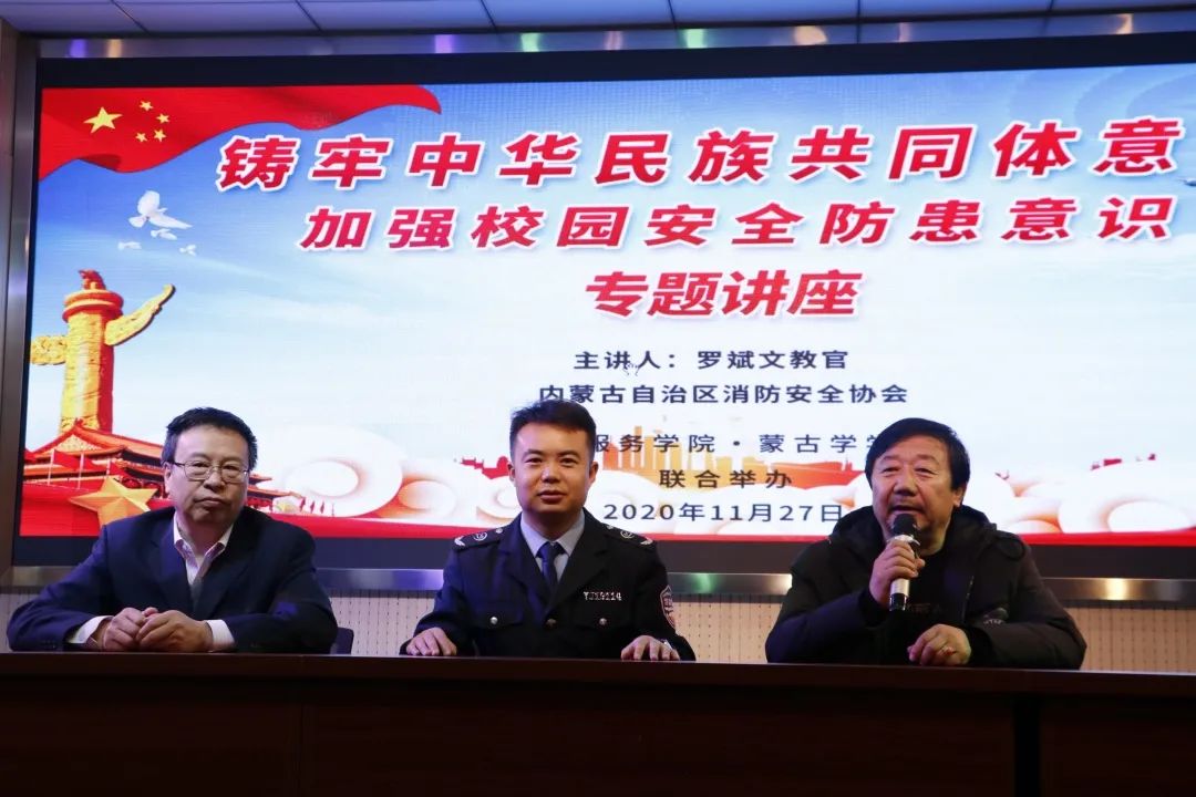 讲座由现代服务学院党总书记黄中、蒙古学学院李青龙共同主持,内蒙古自治区罗斌文教官主讲。