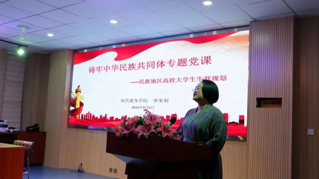 9月4日晚,党总支书记李荣利为新生进行了铸牢中华民族共同体专题讲座。讲座中,李荣利书记将铸牢中华民族共同体意识与坚定崇高理想信念相结合,从中华民族多元化一体的基本国情、民族团结进步事业的伟大成就、新时代民族工作高质量发展、做民族团结进步的践行者四个方面展开,为全体学生做了一场理想信念教育。她强调,青年学生要牢固树立休戚与共、荣辱与共、生死与共、命运与共的共同体理念,不断增强运用党的创新理论分析处理问题的能力,为民族团结进步做出自己的贡献。