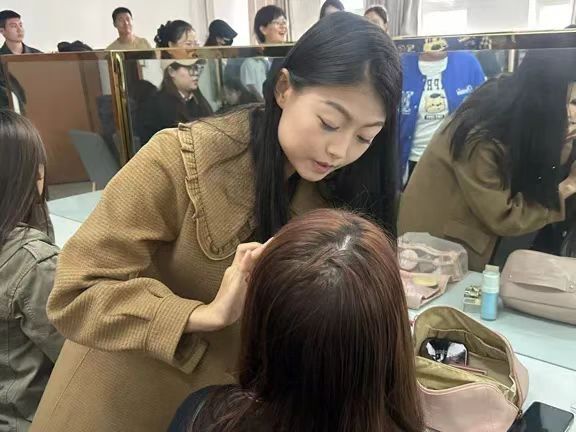 随后,在现代服务学院化妆教室,沈佳雯老师用自己的专业知识,分别从发型、服饰、妆容、站姿、坐姿优雅的体态礼仪等方面进行了全面指导,让在场的同学们受益匪浅。