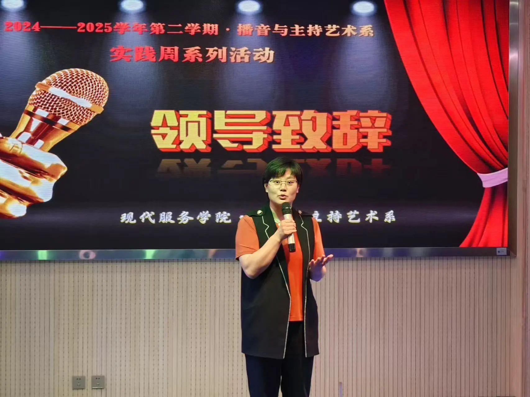 为深入贯彻“以学生为中心”的教学理念,落实立德树人根本任务,现代服务学院播音与主持艺术系于6月25日隆重举办了“播音生基本功大赛”,作为播音专业实践周的重要环节之一,本次活动不仅是一次教学成果的检阅,更是一次师生共同参与、协同成长的教学实践探索。大赛邀请王晓玉、沈佳雯、宝力、吕雅玲四位专业教师担任评委,党总支书记李荣利、副书记毛慧、副院长刘春芳作为嘉宾出席观赛