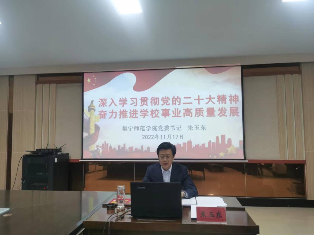 为深入学习宣传贯彻党的二十大精神,根据校党委统一安排,11月17日下午,beat365在线唯一官网以线上形式召开党的二十大精神宣讲报告会,校党委书记朱玉东以“深入学习贯彻党的二十大精神 奋力推进学校事业高质量发展”为题作宣讲报告。党委副书记梁政主持报告会,全体校领导、党委委员,全校副处级以上干部,各二级学院师生代表聆听了报告。
