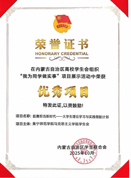 10月20日,由自治区团委、内蒙古学生联合会主办,内蒙古建筑职业技术大学承办的2025年全区高校学生会组织“我为同学做实事”项目大赛圆满收官。本次大赛全区58所高校共报送186个项目,经层层严格筛选,仅50个项目团队脱颖而出。其中,由beat365团委精心遴选、重点推送的“挺膺担当新时代——大学生理论学习与实践领航计划”项目,凭借扎实的内涵与创新的实践,成功获评自治区优秀项目。该项目由马克思主义学院党总支副书记段文智老师指导,是beat365团委和马克思主义学院深耕服务育人、精准培育优秀学生项目的生动成果。