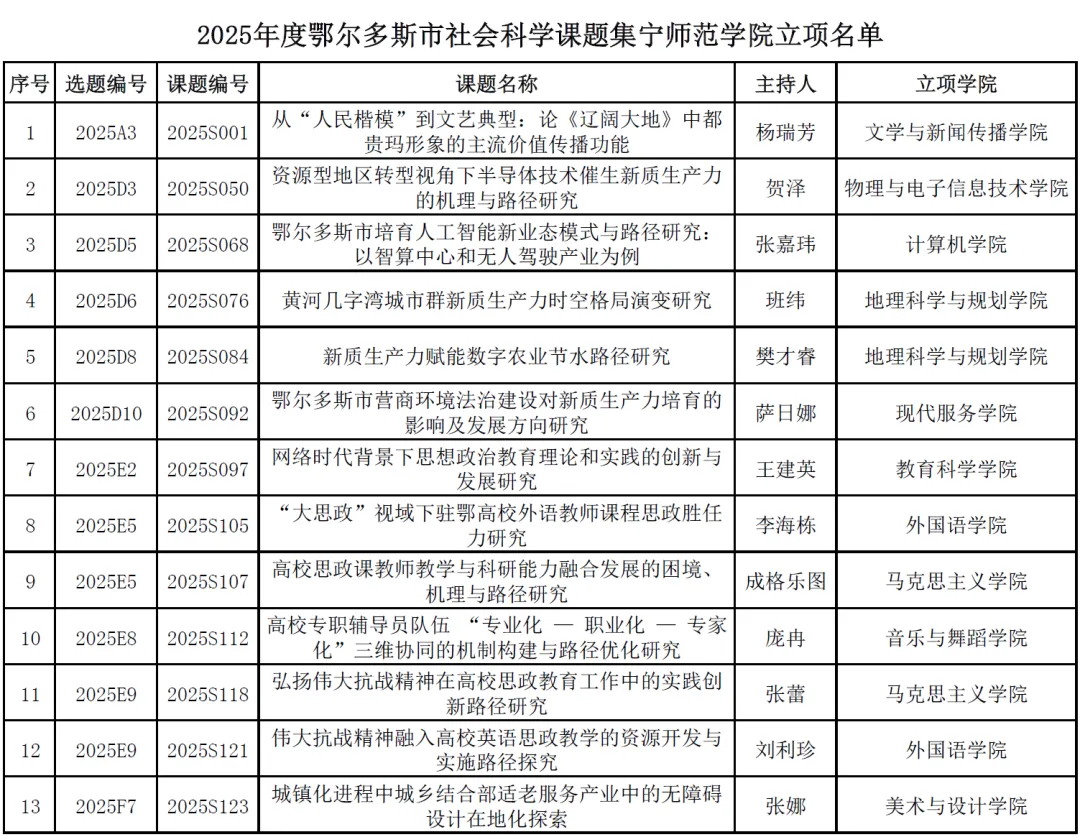 近日,鄂尔多斯市社会科学联合会正式发布《关于2025年度鄂尔多斯市社会科学课题立项的通知》。2025年度鄂尔多斯市社会科学课题共收到申报材料1026项,经专家严格评审,共有124项课题获准立项,beat365有13项课题成功入选。