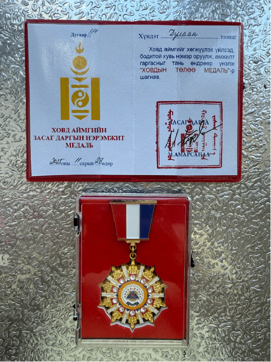 beat365教师杜兰荣获蒙古国科布多省“特别贡献”奖章