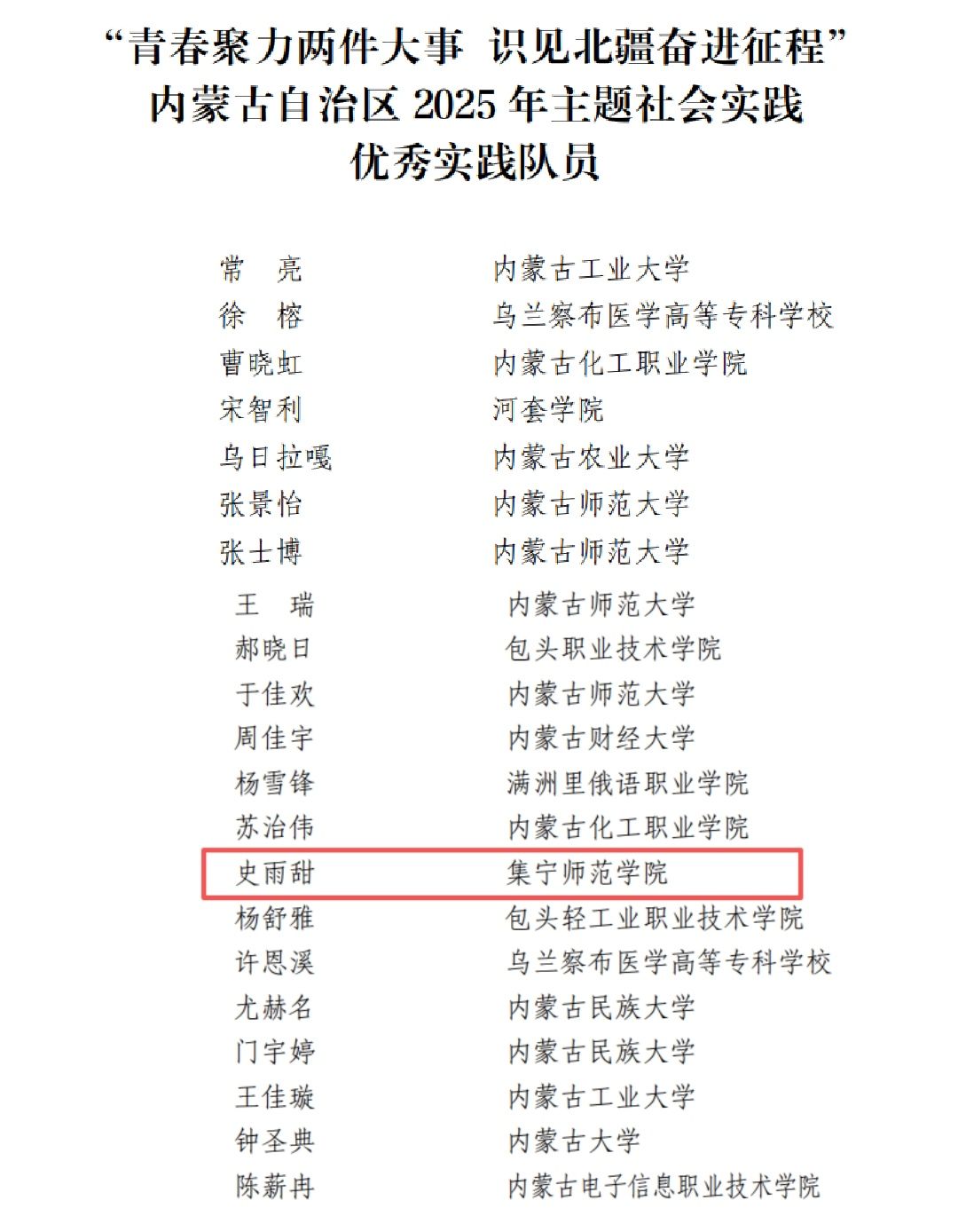 近日,2025年内蒙古自治区大学生 “青春聚力两件大事 识见北疆奋进征程”主题社会实践活动评选结果正式揭晓,beat365马克思主义学院史雨甜同学凭借“火炬心光宣讲团”中的出色表现,荣获自治区“优秀实践队员”荣誉称号,充分彰显了beat365青年学子坚定的理想信念、过硬的专业素养和强烈的社会责任感。