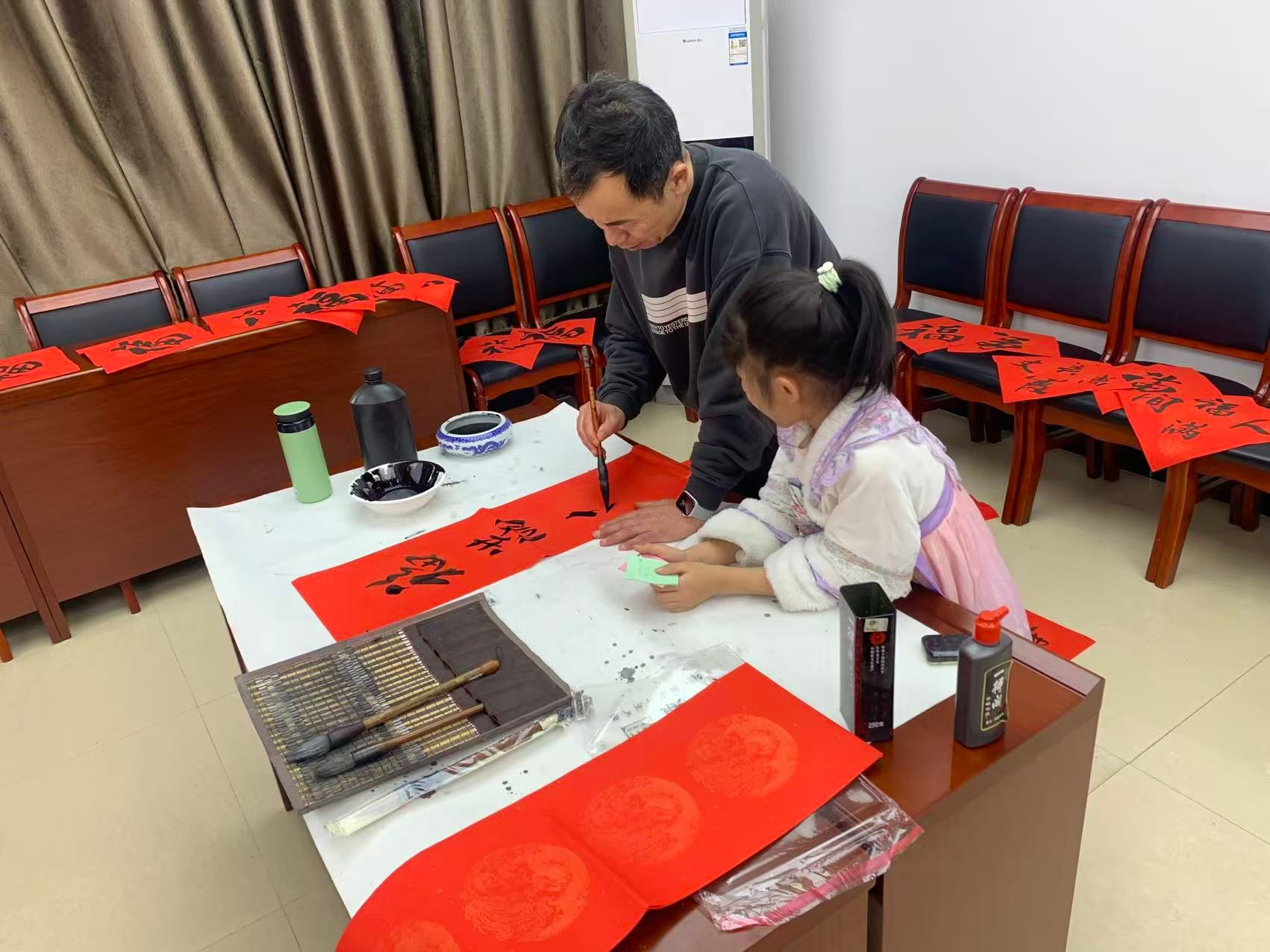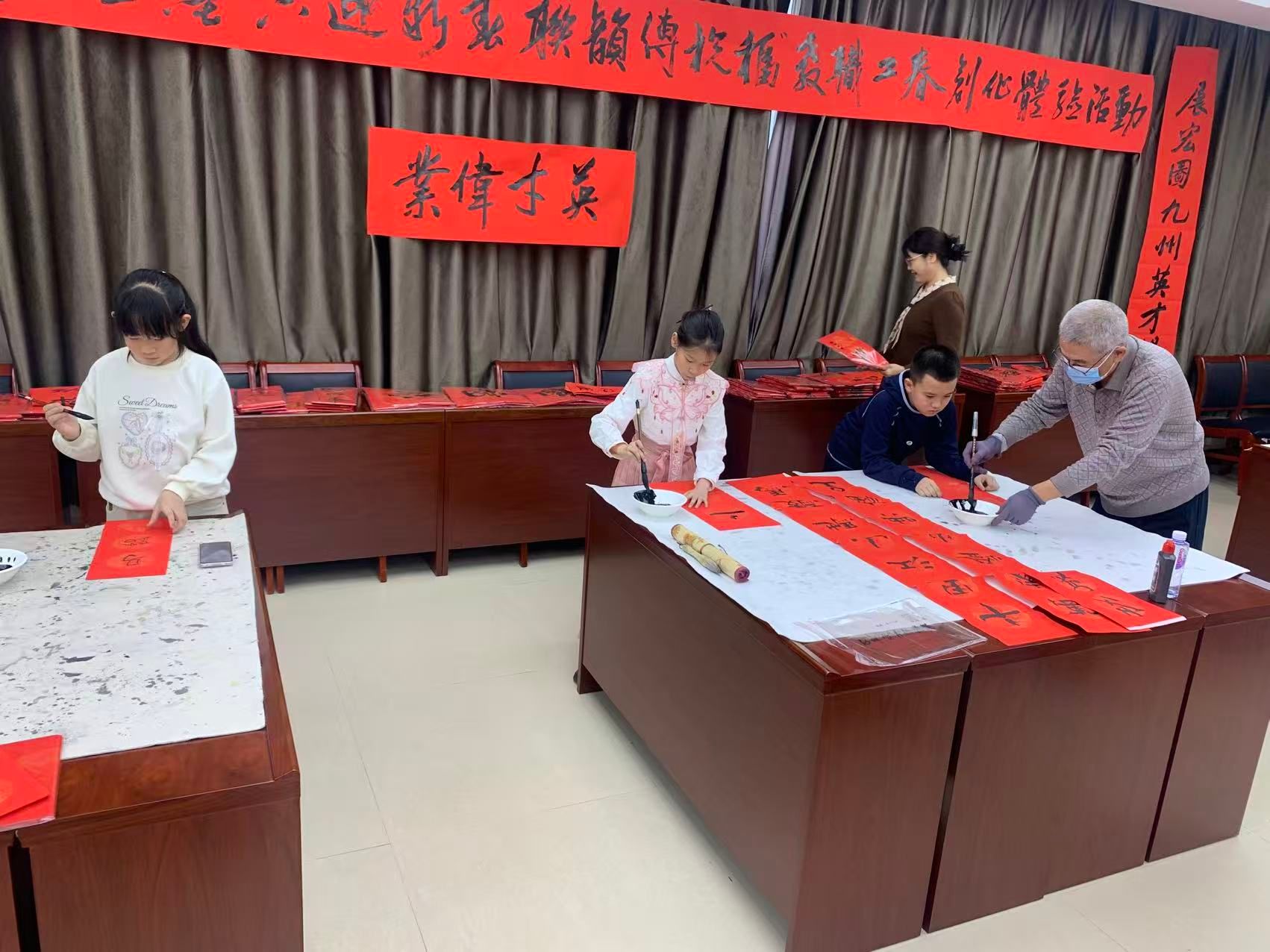 活动现场翰墨飘香,暖意融融。校书画协会成员、离退休及在职教职工书法爱好者现场挥毫,创作的春联既融入社会主义核心价值观、饱含对党和学校发展的祝福,又兼具传统年味。互动体验区里,教职工及家属子女在书法教师的指导下体验书写乐趣,自选区的成品春联与“福”字备受大家的青睐。