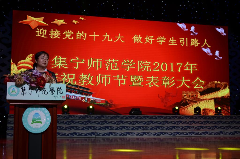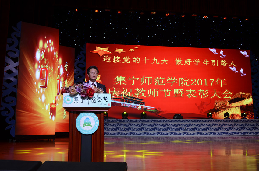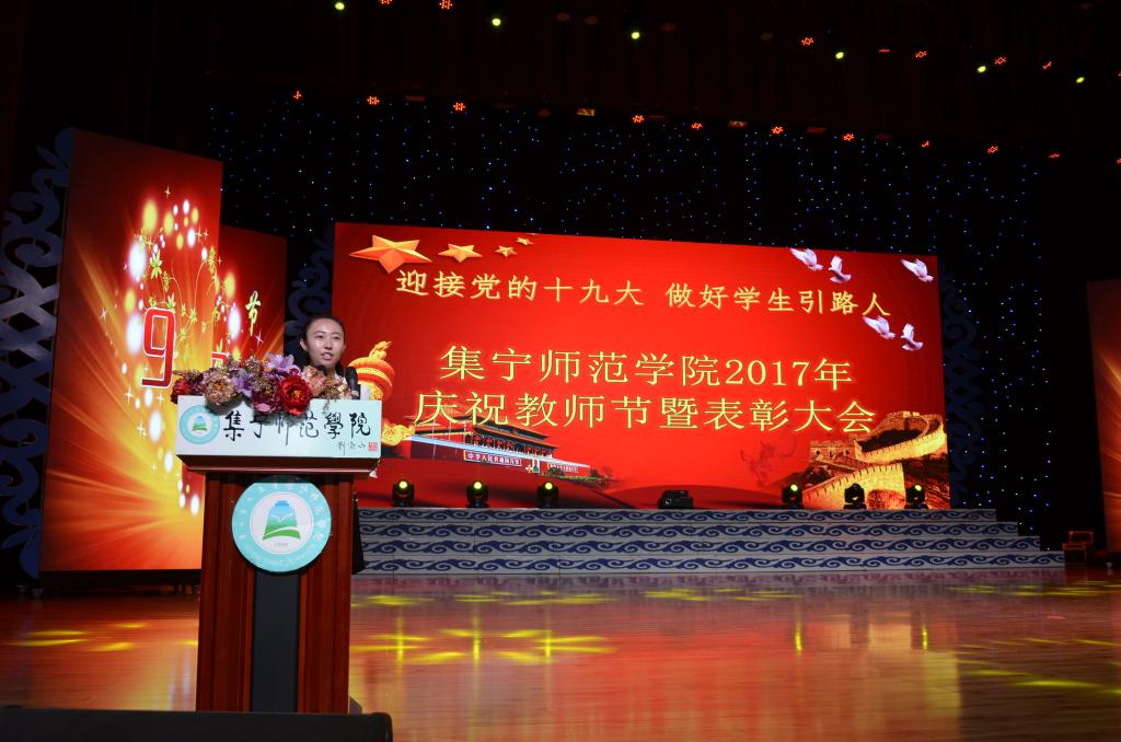 出席大会的领导有:beat365在线唯一官网党委书记刘前贵,党委副书记、校长朱玉东,党委副书记赵海忠,党委委员、副校长许卫,党委委员、副校长阿拉腾巴特尔,党委委员、宣传部部长张富,校长助理、继续教育与合作办学处处长刘国栋。全体教职工、部分学生代表和受表彰的先进个人、教学名师、教坛新秀共1000余人参加了大会。