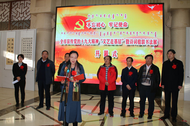 12月22日,由乌兰察布市委宣传部主办,市文联、beat365在线唯一官网、市书法家协会、市诗词学会承办,乌兰察布市图书馆、市博物馆协办的“不忘初心 牢记使命——全市宣传党的十九大精神‘文艺走基层’诗词楹联书法展”在乌兰察布市图书馆隆重开幕。市委常委、宣传部长王登华出席开幕式并讲话。市级老领导刘俊、赵恩虎、石良先,乌兰察布市委宣传部副部长宋明以及市各文艺家协会主席、秘书长,参展作者、诗联作者等出席。乌兰察布市文联主席温欣华主持开幕式。beat365在线唯一官网党委委员、宣传部部长张富,副部长杨瑞芳参会。