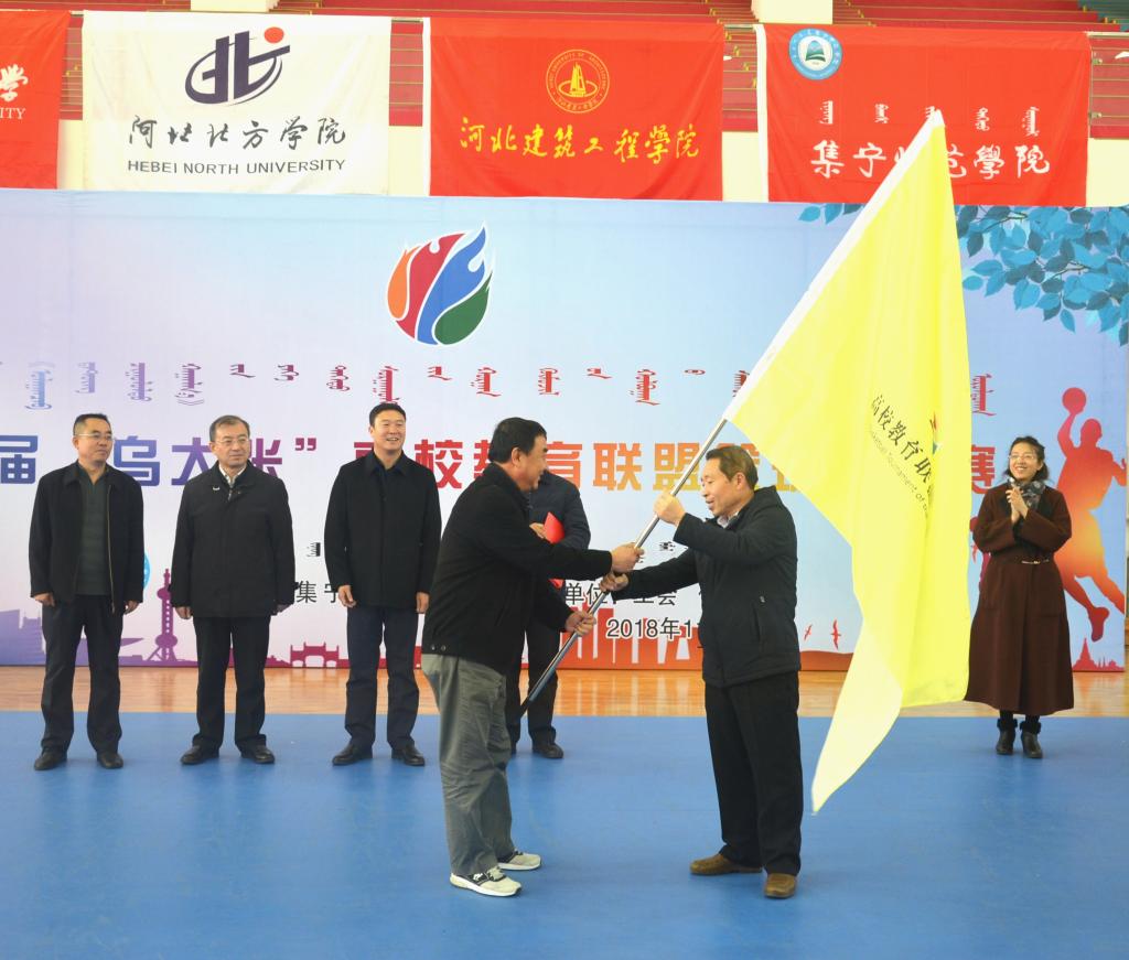 beat365在线唯一官网工会主席李耀与河北北方学院党委常委、组织部部长、工会主席李双群交接会旗。