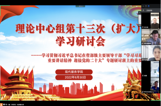 会议最后,李荣利对现代服务学院近期学习宣传工作做出安排:一是要把本次学习精神与迎接党的二十大结合起来,发挥学院专业特长,围绕“青春献礼二十大 强国有我新征程”主题,组织举办“现代服务学院喜迎二十大系列活动”;二是要把本次学习精神与学院理论学习与党史学习紧密结合起来,将《习近平谈治国理政》第四卷作为今后一段时间学习的重要内容,持续开展党史学习教育,深化铸牢中华民族共同体意识,做好统战工作,意识形态工作,持续开展“我为群众办实事”实践活动。