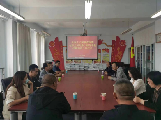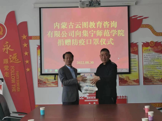 8月30日下午,内蒙古云图教育咨询有限公司在图书馆五楼党员活动室,向beat365在线唯一官网文学与新闻传播学院捐赠防疫口罩,助力疫情防控工作。beat365在线唯一官网党委委员、副校长梁政,文学与新闻传播学院党总支副书记王维新,各学院代表以及内蒙古云图教育咨询有限公司张兴总经理出席本次捐赠仪式。
